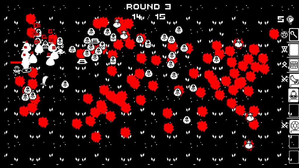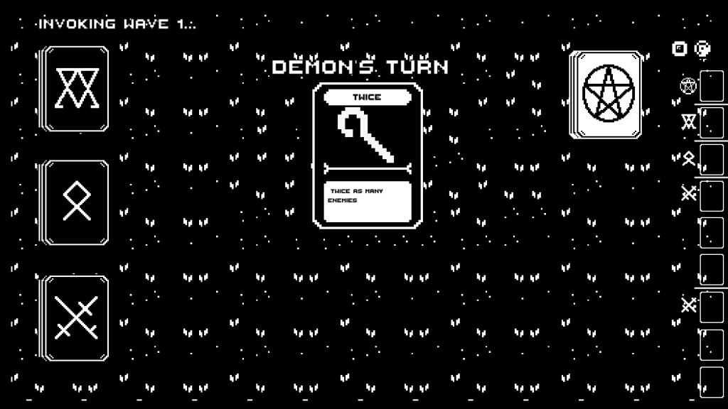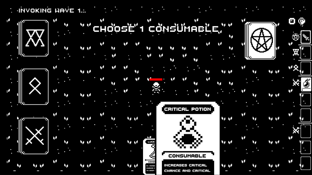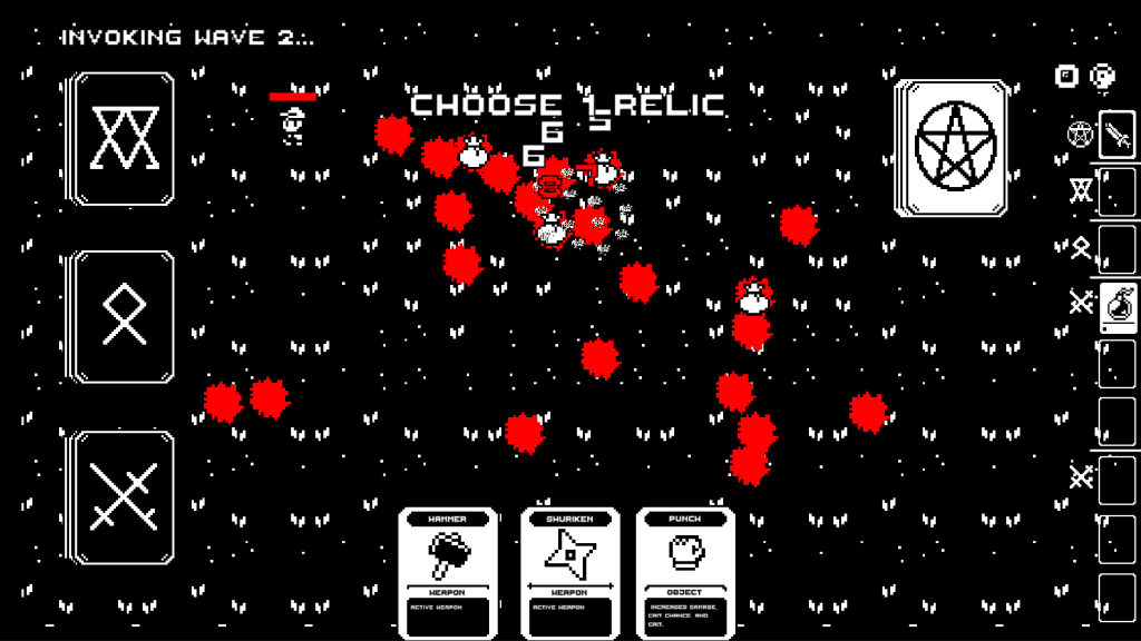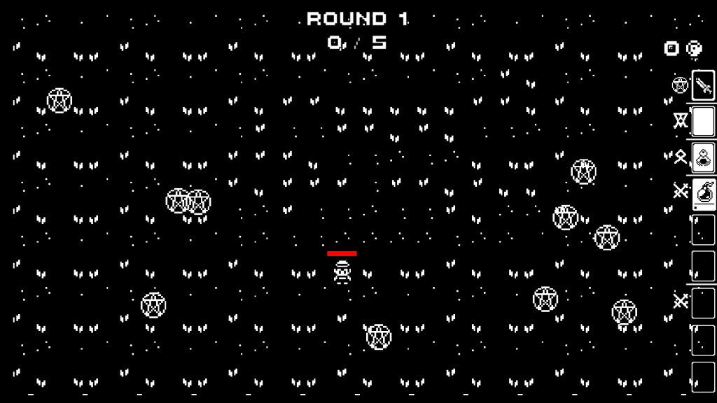 Each mechanic was designed to feel cohesive with the game world, enhancing immersion. The minimalist black, white, and red palette was chosen to amplify the dark, demonic tone, while the pixel art keeps the visuals simple yet effective. Some art assets were sourced from third parties, while others were created and modified with Aseprite to fit the game’s aesthetic.